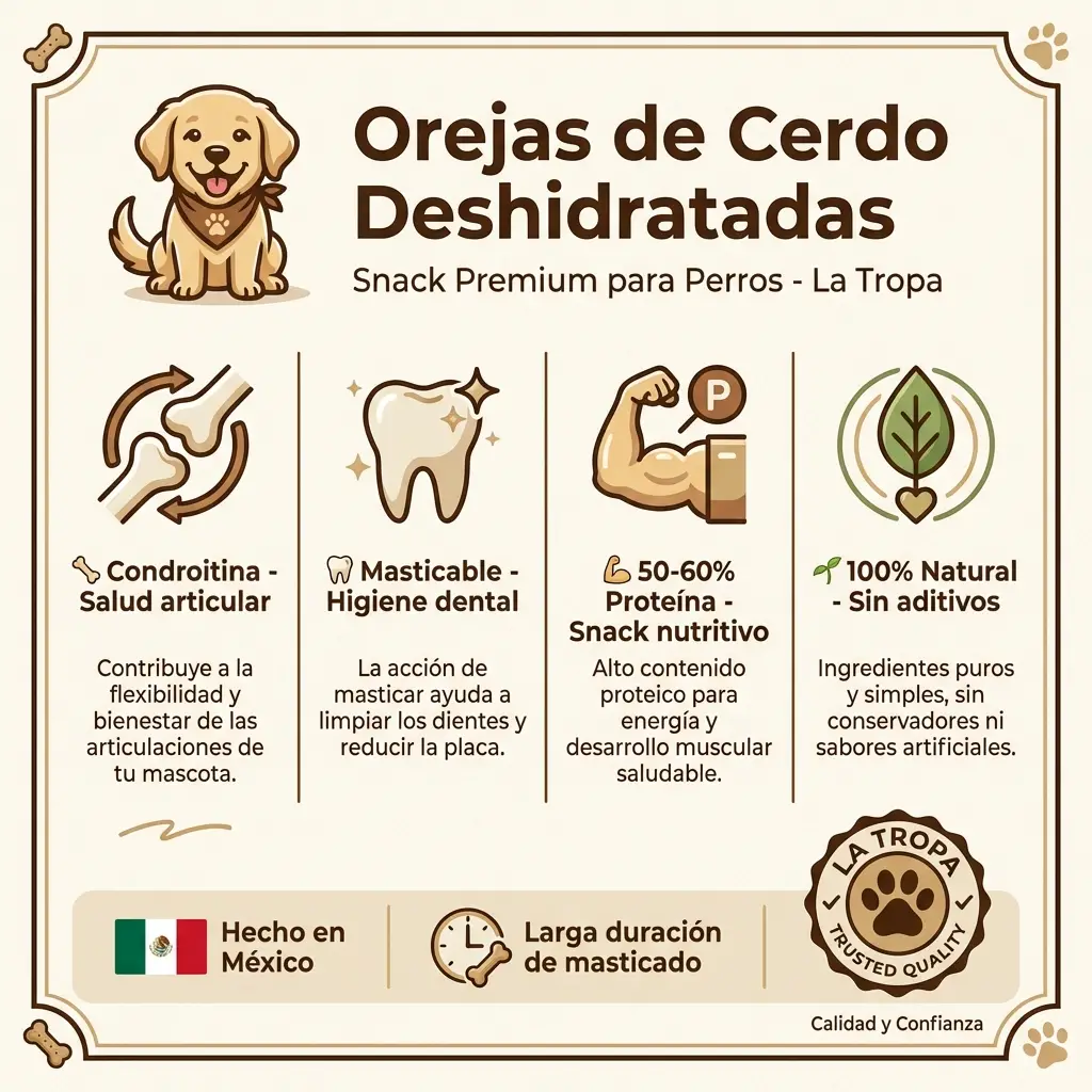 Hecho con cuidado por La Tropa. Orejas de cerdo deshidratadas, limpias y sin aditivos. Nuestro proceso de deshidratación lenta a baja temperatura conserva nutrientes y textura, creando un snack sabroso y seguro para perros.